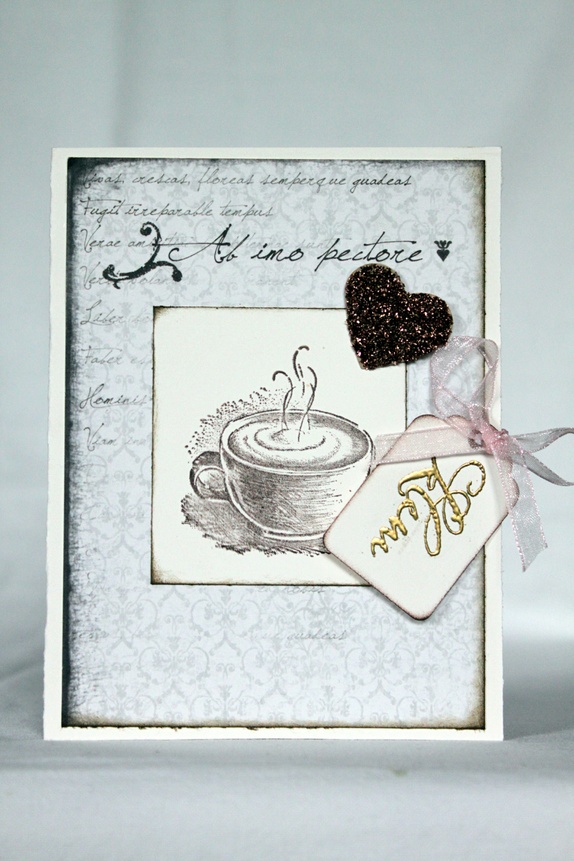 Fargene går i krem, kaffe og gull. En kaffekopp er stemplet i mørk brunt, og et hjerte med gsjokofarget glassglitter pynter opp. Ved inngangen til kortet er det festet en merkelapp med rosa sløyfe og teksten "Klem " i gullembossing.