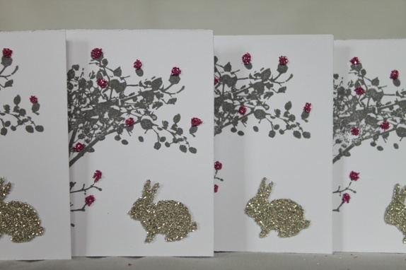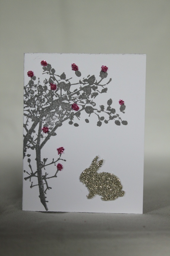 Motivet er en harepus i sølv glassglitter som kikker opp mot et tre med "bær" av rosa glassglitter.
