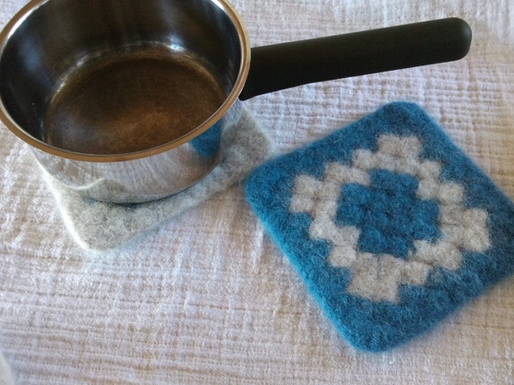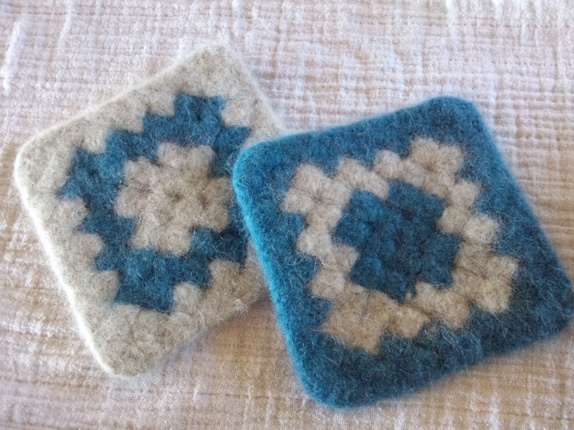 Heklet som en oldemorsrute i 100% ullgarn, og tovet i vaskemaskinen!