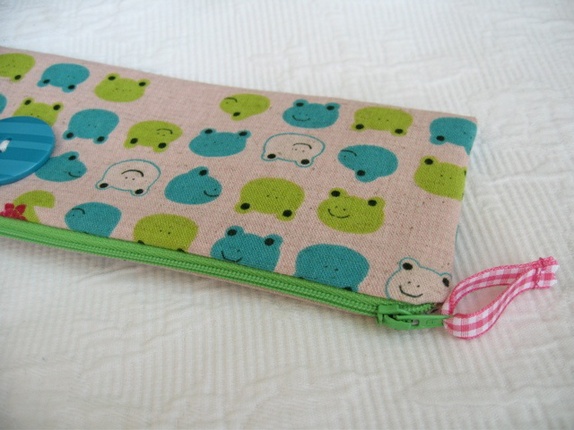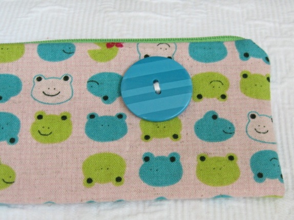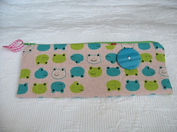 Sydd i bomull/lin med frosker i blått og grønt. Foret med bomull i grønt med bittesmå ruter. Med strykeinnlegg på begge lag.