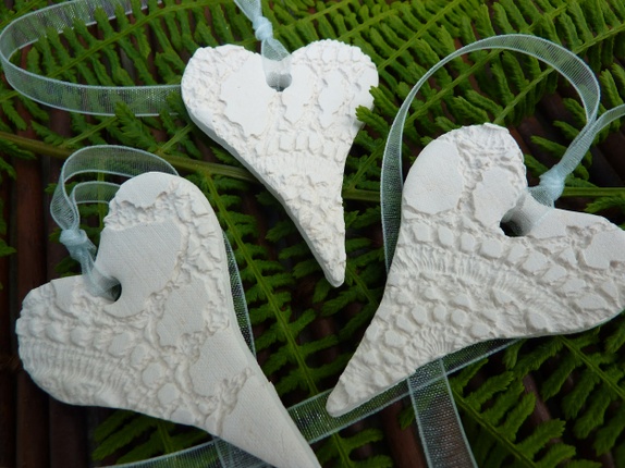 Nå har jeg laget keramikk hjerter i hvit leirgods.Det er bånd til hvert hjerte som kan knytes på pakken.Du kan også henge opp hjertene i vinduet om du har lyst til det.Målene på hjertene er 4,5 cm x 6 cm (bredde x høyde)