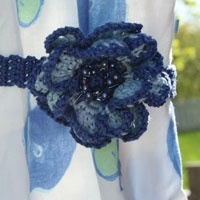 Deilig sommerkjole med blå epler. Kjolen har flott tilbehør, heklet belte med stor heklet blomst i to blåtoner og pyntet med perler.