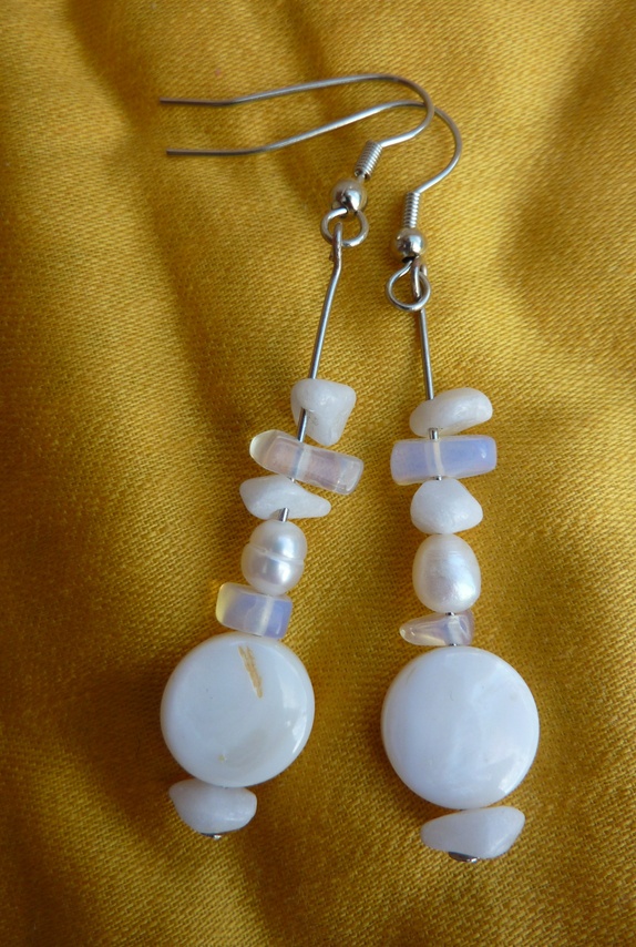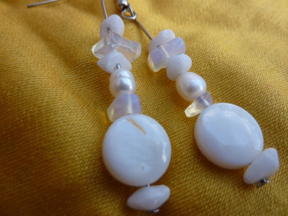 Ferskvanns perler, perlemor, hvite og blanke steiner.