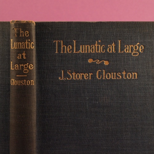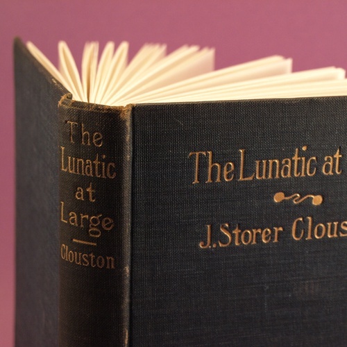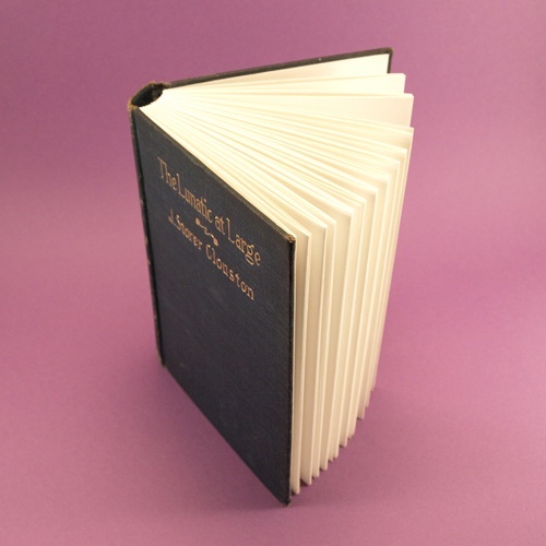 Håndsydd, ulinjert bok som er festa inni omslaget til ”The Lunatic at Large” skrevet av J. Storer Clouston. Jeg falt pladask for denne boka på et loppemarked, og syntes spesielt tittelen var helt fantastisk. Boka er litt slitt i ryggen, men jeg har forsterka den på innsiden, så dette har ingen betydning for holdbarheten. Derimot gir det boka enda mer sjarm, og gjør at den ligger flatt når den blir åpna.