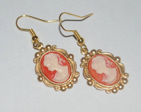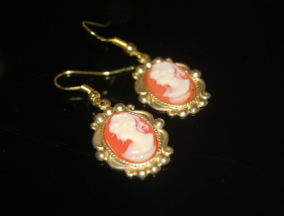 Søte små kaméøredobber i vintagestil. Gullfarget messinginnfatning og ørekrok. Orange kamé med klassisk motiv.