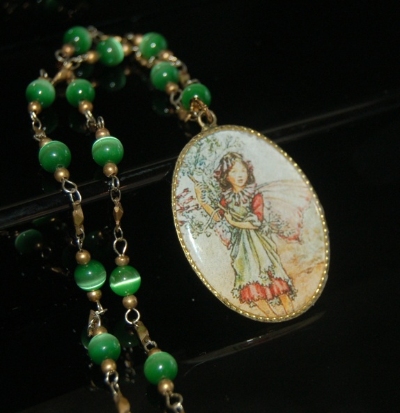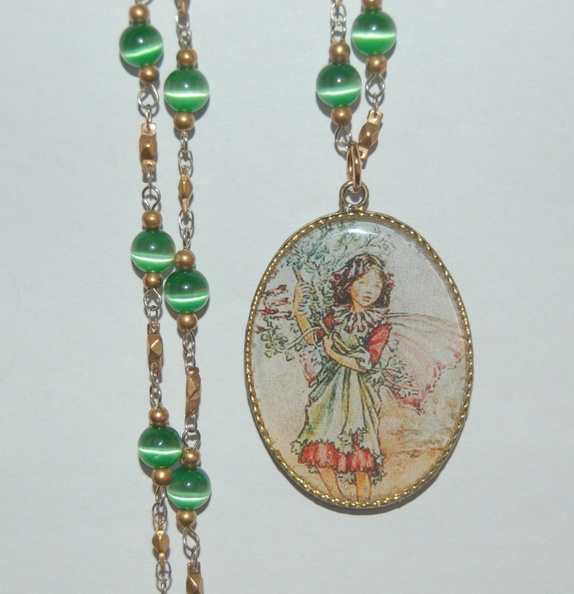 Anheng med en liten nydelig fe hengende på vintage kjede. Kjedet har grønne "tigerperler" og er 62 cm. langt. Gullfarget lås. Kjedet kan forkortes om ønskelig. Anhenget er 3,2 x 4,5 cm.