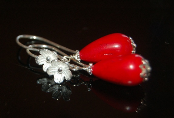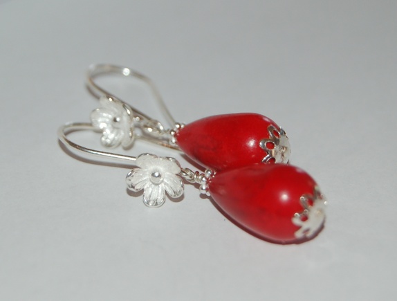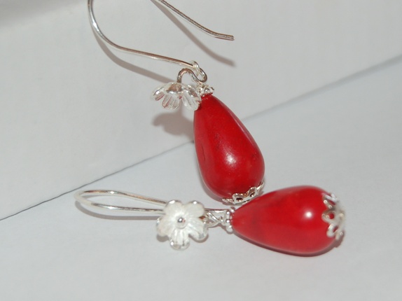 Ørepynt med rød turkis på nydelig dekorert ørekrok i sterling sølv. Alt metall er sølv 925.