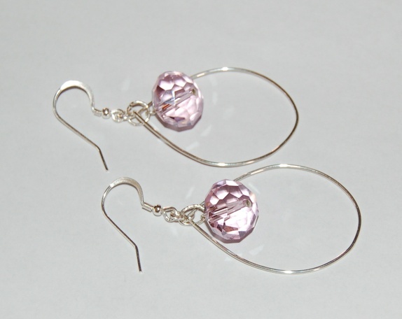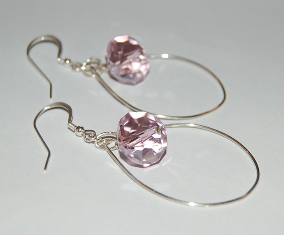 Ørepynt i sterling sølv med en stor rosa, vakker kinesisk krystall. Ringene er sølvtrå jeg har bøyd selv og ørerringene har derfor et sjarmerende tydelig håndlaget preg. Krystallen er 16mm og ringen ca. 2,8 cm bred og 4 cm lang. Totalt ca 6 cm lang.