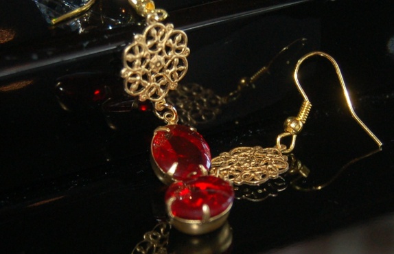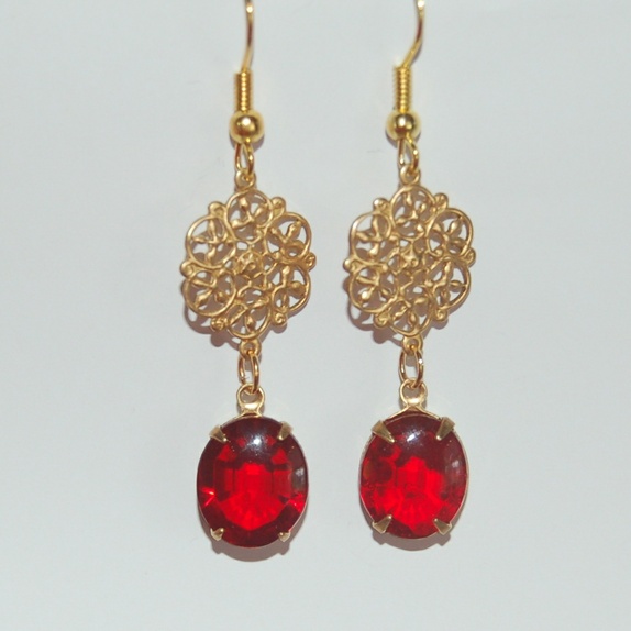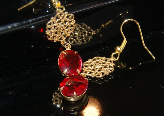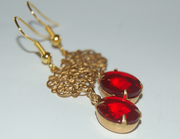Søte røde øredobber med gullfarget filigran. Tysk vintage glassten.