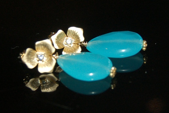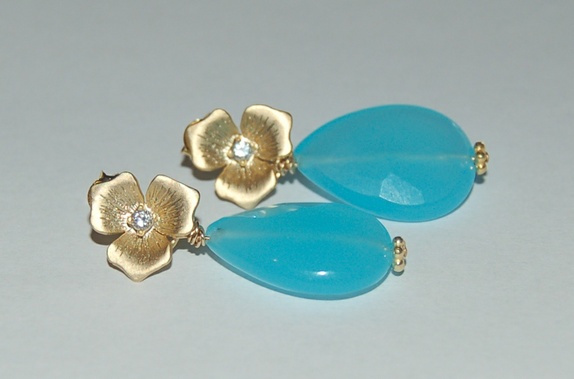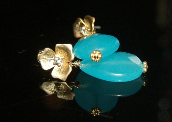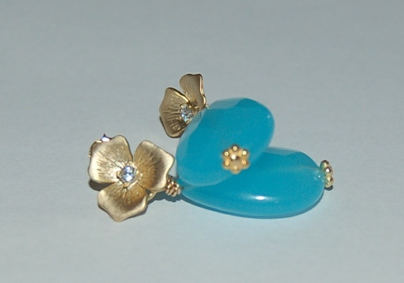 Ørepynt med en dråpe blå opal på 16 karat gullbelagt messingblomst med Cubic Zirconia. Sølv 925 ørestikk og vermeil (24 karat gull på 925 sølv) prestekrager.