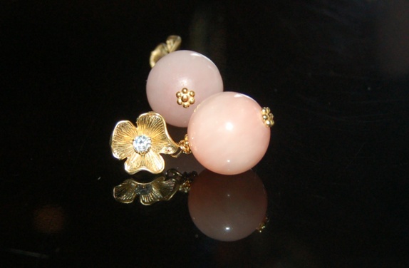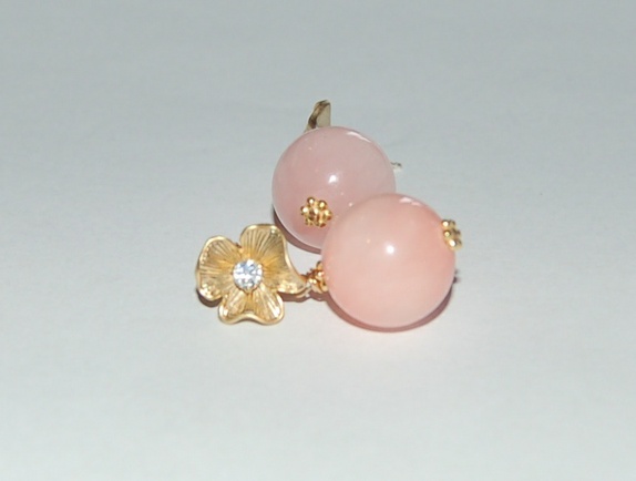 Ørepynt med rosa jade på 16 karat gullbelagt messingblomst med Cubic Zirconia. Sølv 925 ørestikk og vermeil (24 karat gull på 925 sølv) prestekrager.