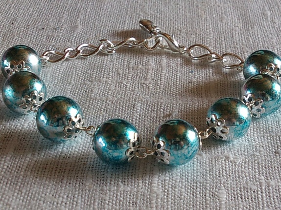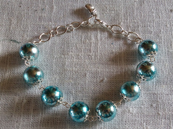 Armbånd med turkise flotte glassperler, lenke og et lite anheng.