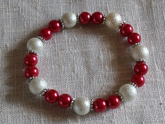 Armbånd tredd på strikk med røde voksede glassperler, hvite snøperler og metalldeler.