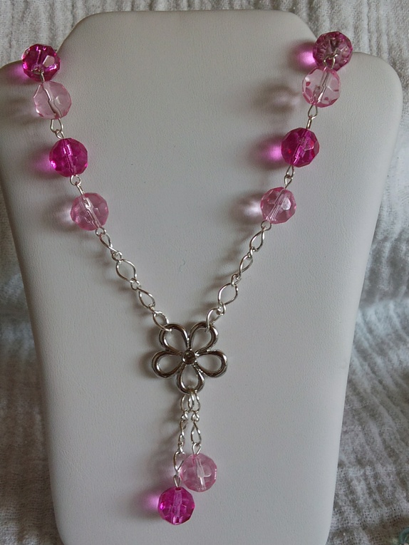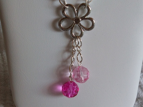 Halskjede laget av lenke og rosa glassperler i to nyanser. Metallblomst med anheng.