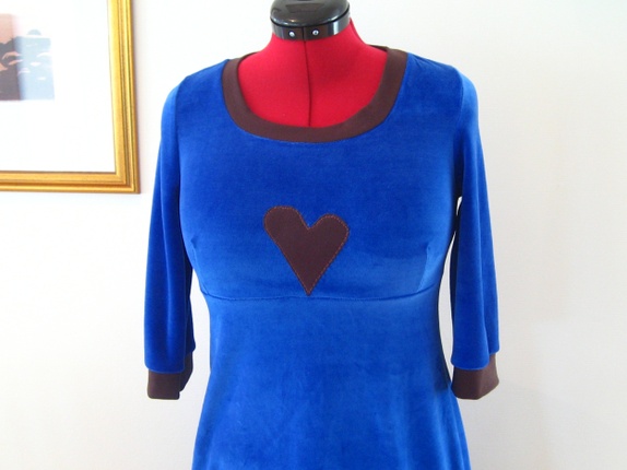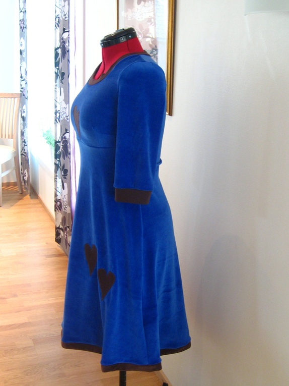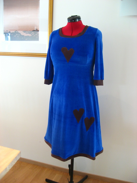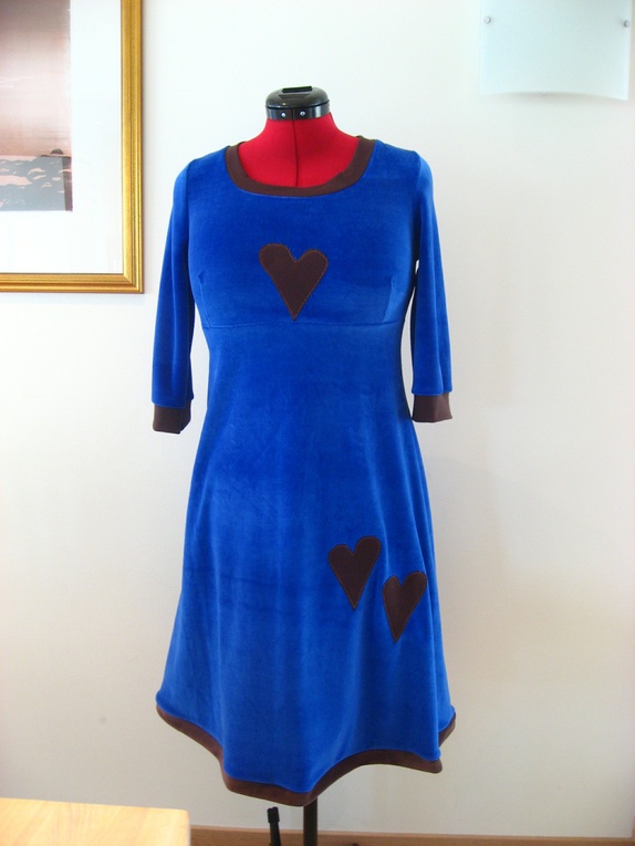 Deilig myk velourkjole i en rolig blåfarge med brune kanter. Aplikasjon av tre hjerter i brunt. Innsnitt på brystet og innsvingt i livet for feminin fasong. God vidde over hofter og i skjørtet.