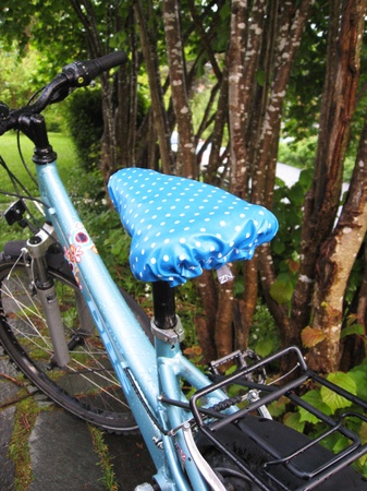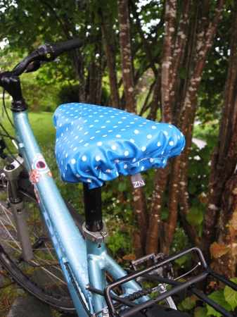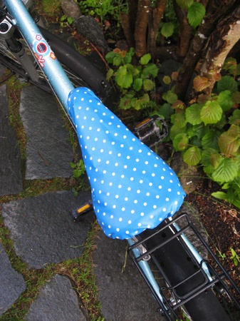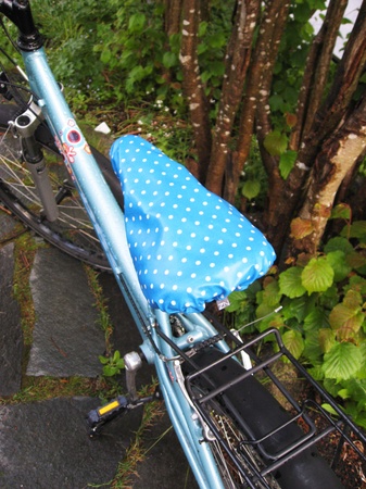 Smart regntrekk til sykkelsete sydd i kraftig plastikkbelagt bomull. Trekket er formsydd og kantet med et rødt skråbånd som fungerer som løpegang til strikken som holder trekket på plass. På undersiden mot stangen ned fra setet er det sydd på en bred strikk slik at trekket sitter stødigere.