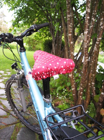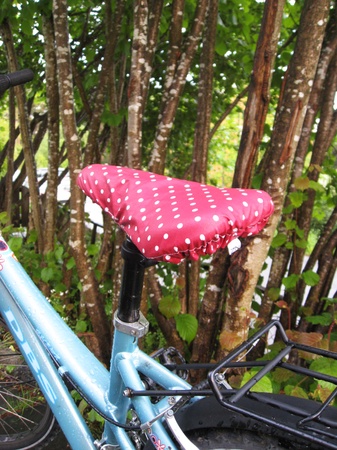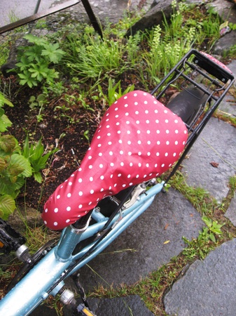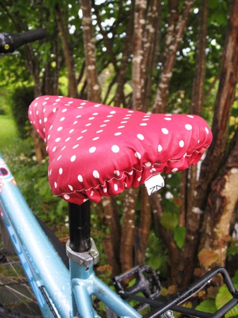 Smart regntrekk til sykkelsete sydd i et plastbelagt bomullsmateriale. Trekket er formsydd og kantet med et rødt skråbånd som fungerer som løpegang til strikken som holder trekket på plass. På undersiden mot stangen ned fra setet er det sydd på en bred strikk slik at trekket sitter stødigere.