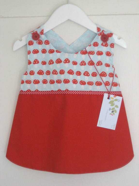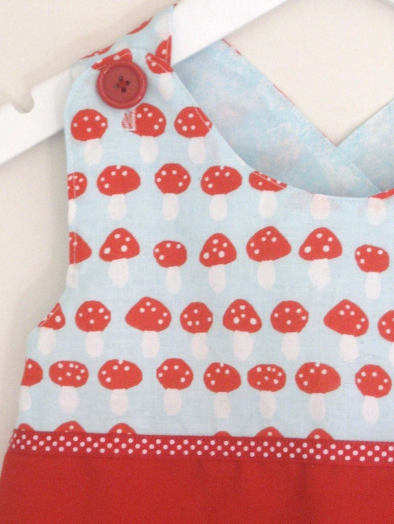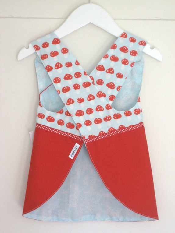Herlig forklekjole sydd i isblå bomull med soppmotiv, og rød ensfarget bomull. Kjolen er pyntet med et rødt bånd med prikker, og er fòret med melert isblått.