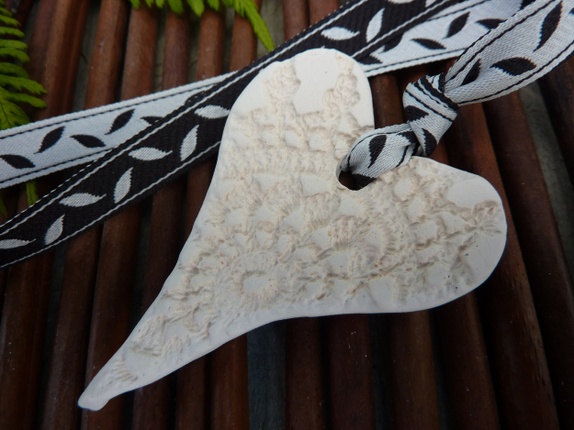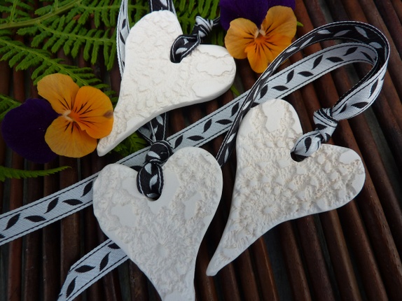 Nå har jeg laget keramikk hjerter i hvit leirgods.Det er bånd til hvert hjerte som kan knytes på pakken.Du kan også henge opp hjertene i vinduet om du har lyst til det.Målene på hjertene er 4,5 cm x 6 cm (bredde x høyde)