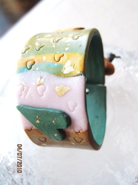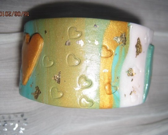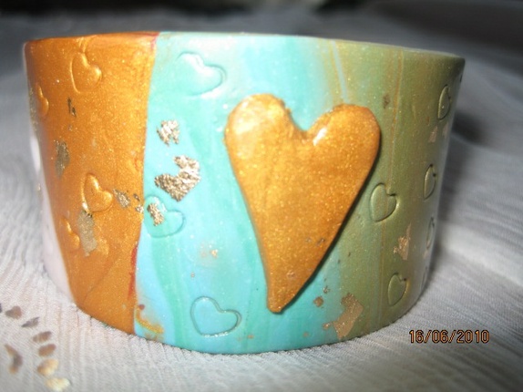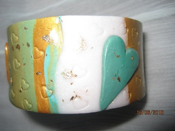 Fimoarmbånd med hjerter. Bredde 3,5 cm. Omkrets 21,5 cm med åpning bak. Armbåndet er lett tøyelig og passer flere størrelser. Det veier lite og er behagelig å ha på.