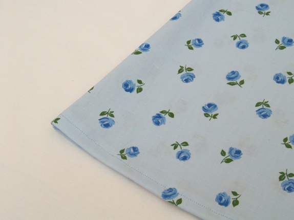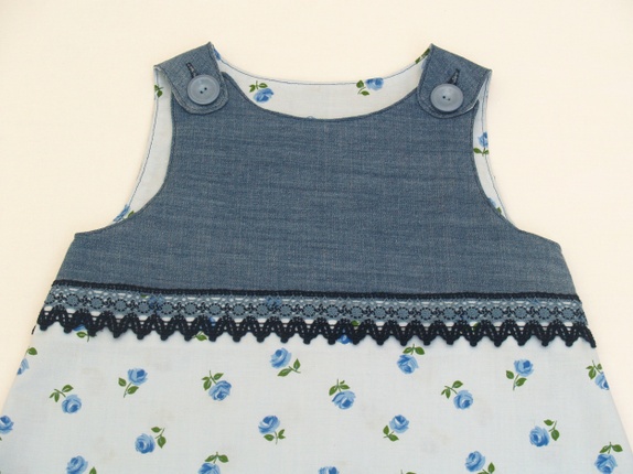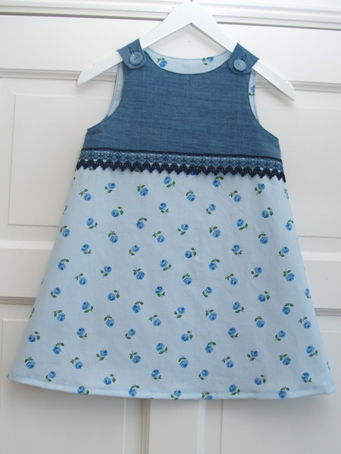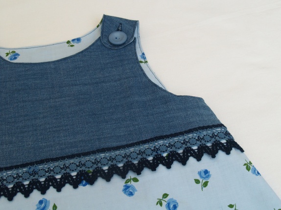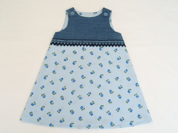 Hengslekjole i blått, sydd av en gjenbrukt dongeribukse og et arvet bomullsstoff som aldri har vært i bruk. Kjolens overdel er sydd av mykt dongeristoff ytterst. Resten av kjolen og foret i overdelen er i bomullsstoff med kongeblå blomster på lyseblå bunn. Over brystet foran og på tvers av ryggen bak er kjolen pyntet med en stor, vevd blonde i to blåfarger.