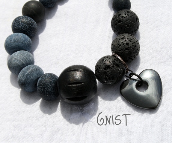 Røft og unikt armbånd laget av rondeller av sort dragevingeagat, store runde lavaperler, blackstone og en stor rund treperle. Regulerbar lås.