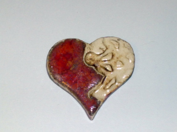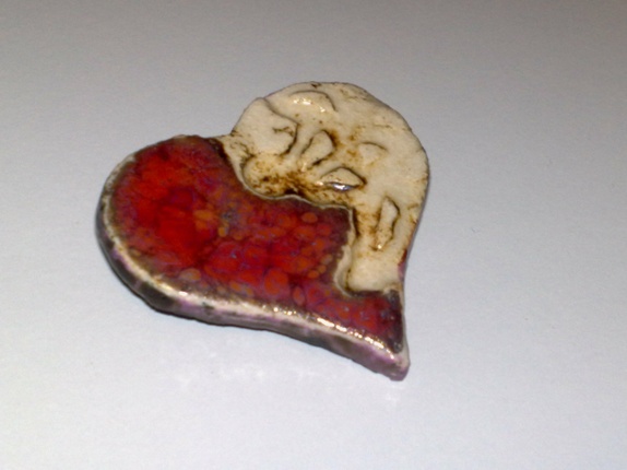 Denne keramikk-brosjen er håndlaget og glasert med fargen krem og varm rød m/ spill i.