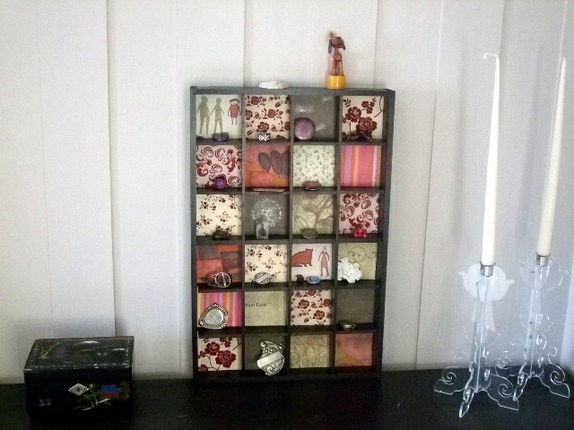 Settekasse med pålimt dekorpapir i rosa og røde nyanser. Str på kassen er 37 x 56 cm og er brunsvart (ikea). Obs! Gjenstandene i kassen medfølger ikke!