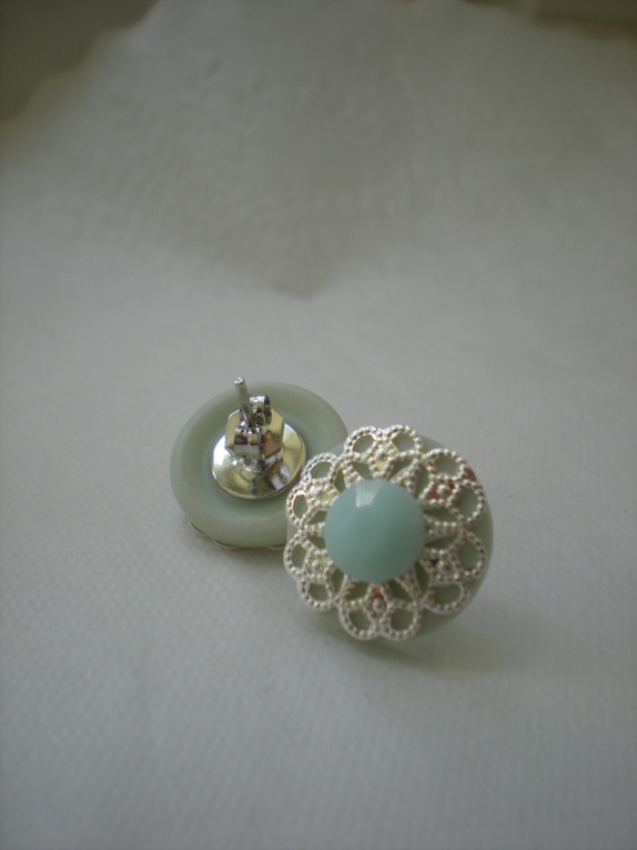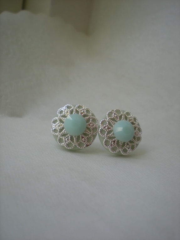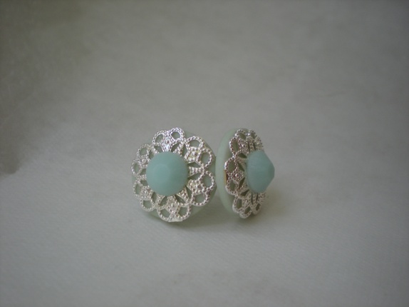 Mintfargede øredobber med sølvfarget pynt og mintfargede swarovski-stener som pynt.