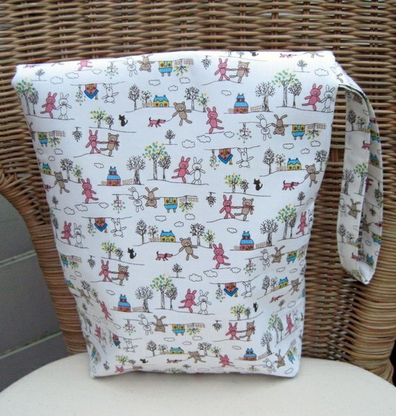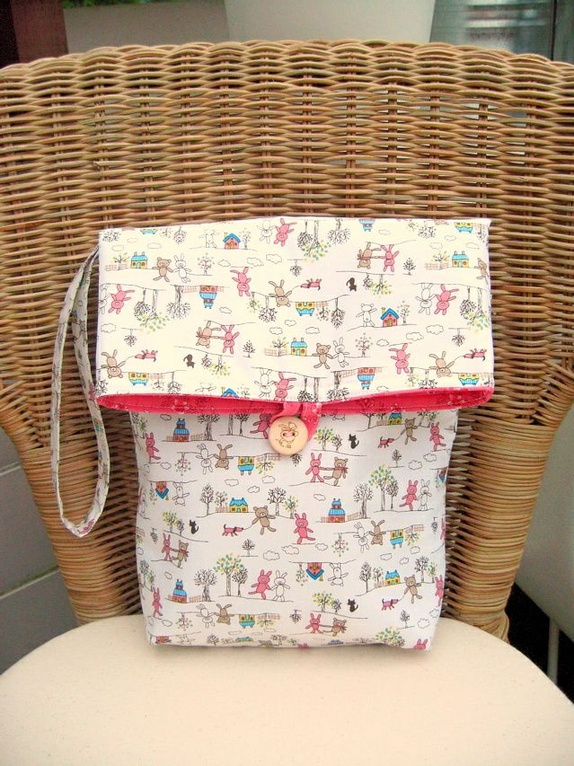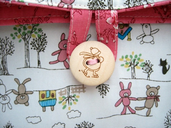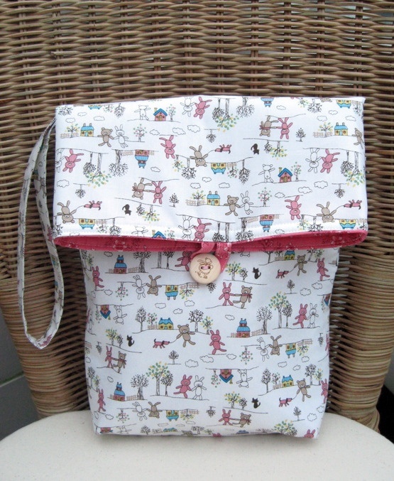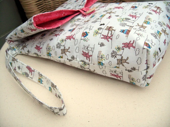 Sydd i et trivelig stoff med små bamser og kaniner i rosa, blått og gult. Foret med korallrosa bomull med små blomster.