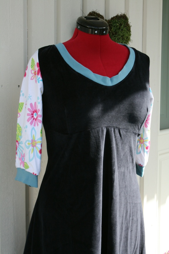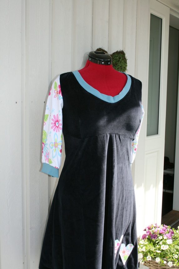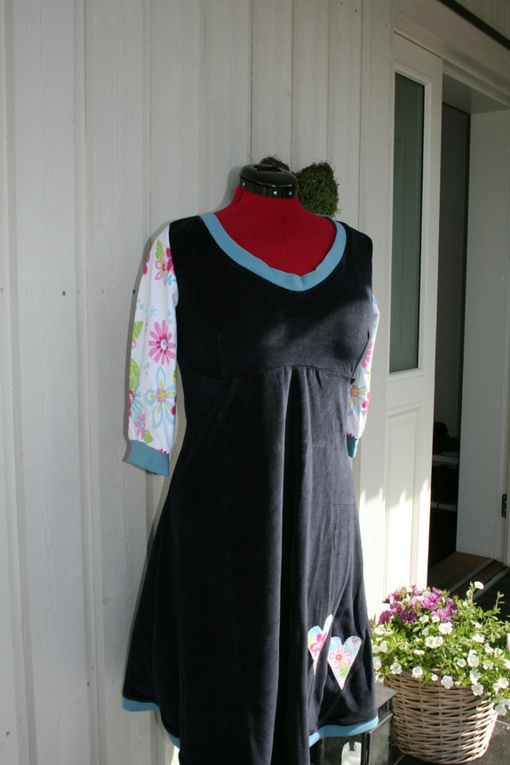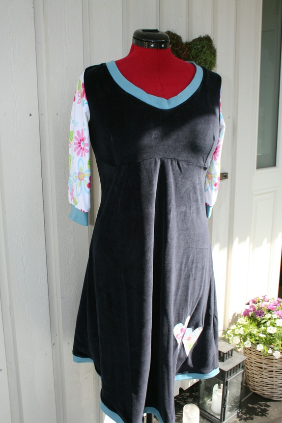 Deilig myk og romslig velourkjole i en rolig blåfarge med blomstrete armer. Aplikasjon av to hjerter. Innsnitt på brystet for feminin fasong. God vidde over hofter og mage, og i skjørtet.