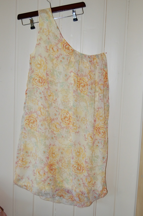 Gulblomstrete asymmetrisk kort kjole i chiffon med sitrongult fôr. 100% polyester. Behagelig og stilig! Str 36 (liten). Vaskes på finvask 30 grader i maskin med vaskepose. A-fasong.