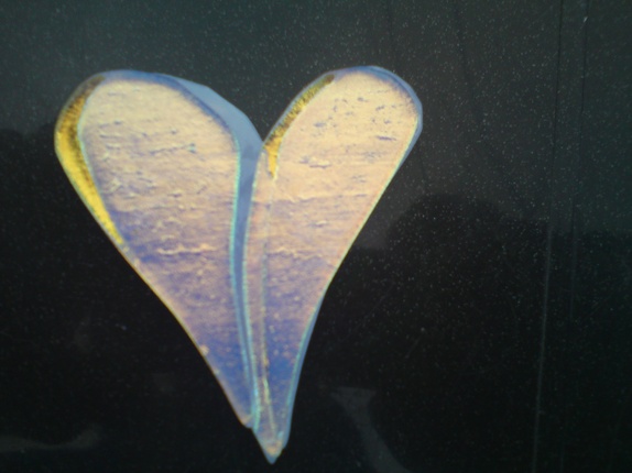Hvit/marmor/gul/rosa aktig glasshjerte , spennende farge, nydelig sammen med hvite klær på brun hud.