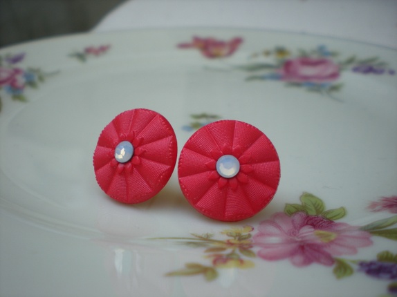 Røde øredobber med mønster og små, hvite swrovski-stener.