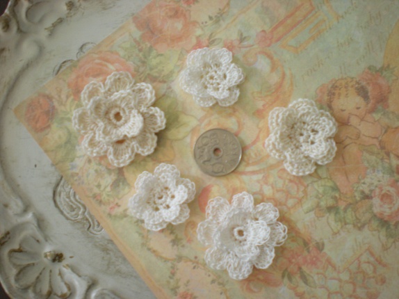 Søte heklede blomster i offwhite tynt bomullgarn, 5 stk pr pakke. Fine til scrapbooking/kortlaging og til pynt på klær. Se str i forhold til kronestykke på bildet.