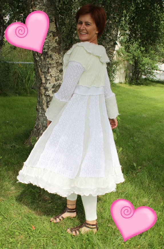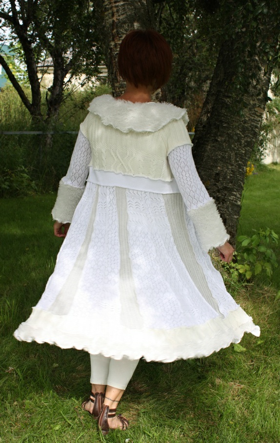 Denne kåpa har jeg redesignet fra strikka gensere og andre strikka plagg som jeg har klippet opp i remser og biter og sydd sammen med utvendig/synlig overlock søm. Kragen, nederst på armene og kanten nede er i et flyffy materiale. Se nærbildet.