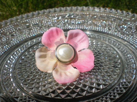 Nydelig ring med rosa stoffblomst og hvit, rund perle.