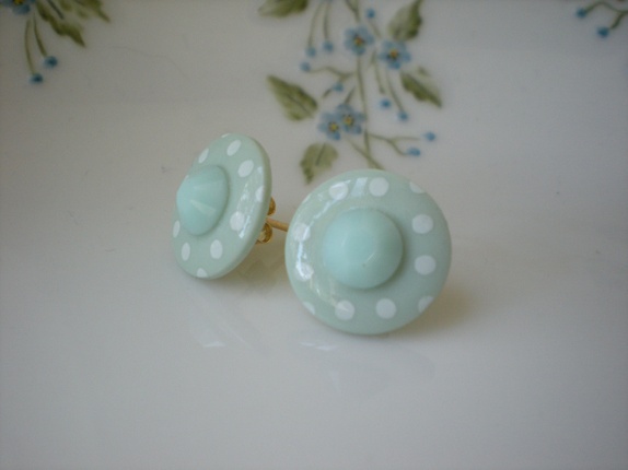 Mint--fargede øredobber med hvite prikker og grønne swarovski-stener.