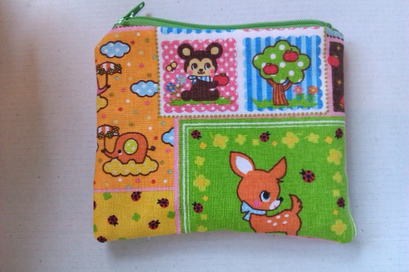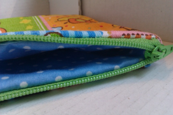 Pung med dyr, grønn glidelås og blå polkadot innerstoff.