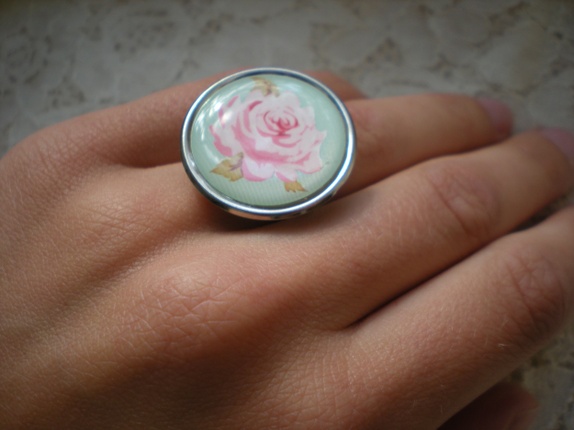 Sirkelformet ring i sjø-turkis farge med rosa blomst.