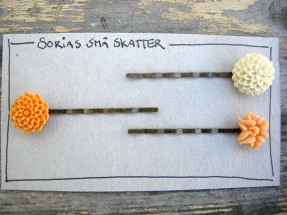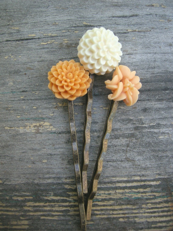 3 nydelige hårspenner i fersken og krem.Hårnål i oksydert kobber med akrylblomster.Limet er profesjonelt smykke lim og etterpå lagt i herder. Hver spenne måler ca 5,5 cm.