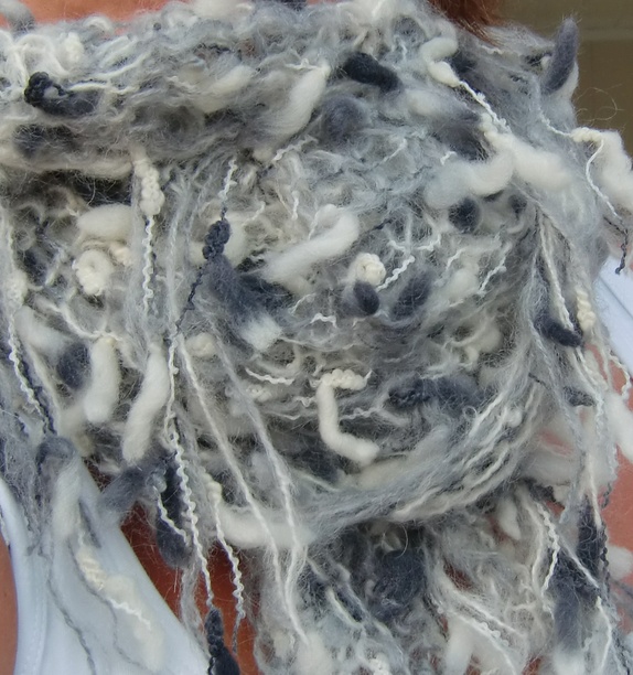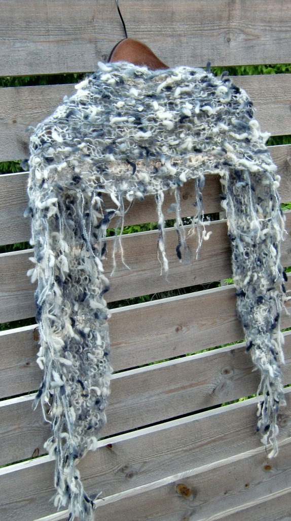 Strikket i mohair og ull i gråtoner og hvitt.