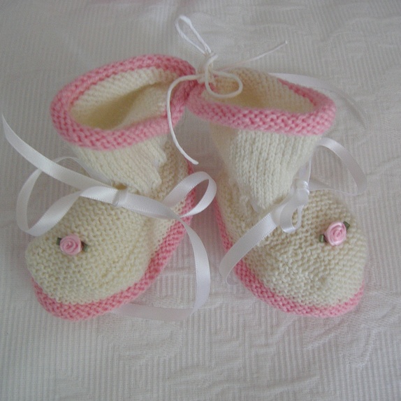 Strikket i babygarn, 100% merinoull. Hvite med rosa kanter, pynterose og silkebånd. Ca. str. 0-6 mndr.