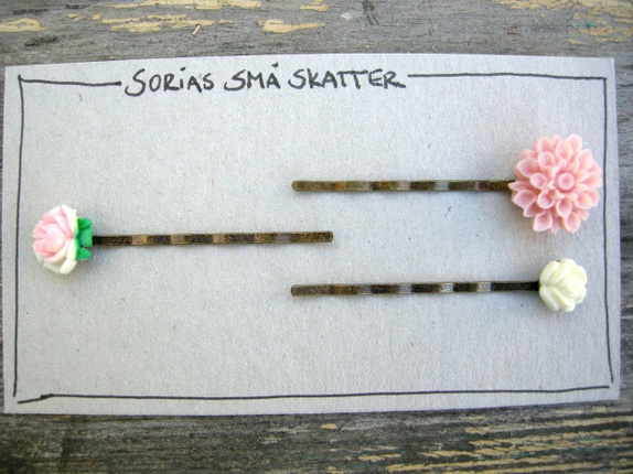 3 nydelige hårspenner i rosa og krem.Hårnål i oksydert kobber med akryl og håndmalt plast blomst.Limet er profesjonelt smykke lim og etterpå lagt i herder. Hver spenne måler ca 5,5 cm.