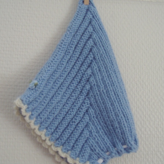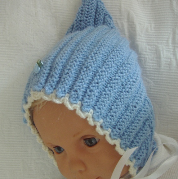 Strikket i babygarn, 100% merinoull. Lysblå med hvit heklet tungekant, silkebånd og rosepynt. Tøyelig, ca. str. 0-12 mndr.