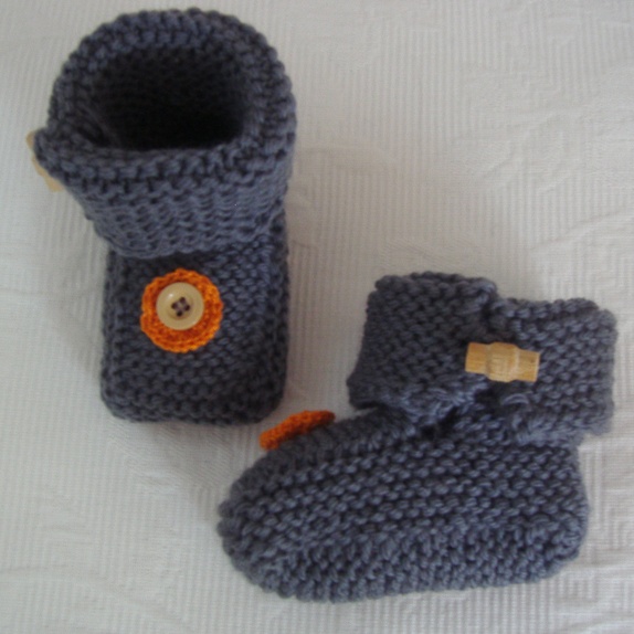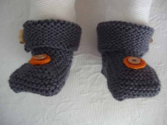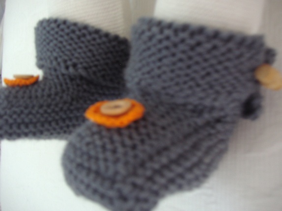 Mørk grå, med treknapp og heklet pynt. Strikket i tykt garn,100% ren ull, superwash. Ca. strl. 6-12 mndr.