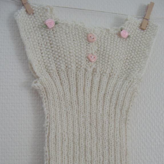 Strikket i hvitt babygarn, 100% merinoull. Med to hjerteknapper, rosepynt og heklet tungekant. Tøyelig, ca. 0-12 mndr.