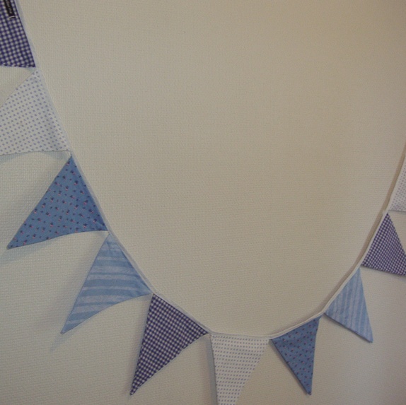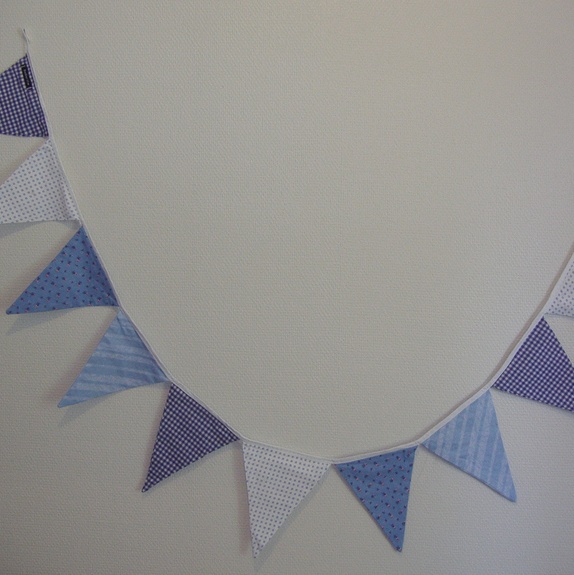 Sydd i bomullstoff i div. blå mønstre. 190 cm lang. 12 trekanter, 13x18 cm. Fin som pynt på barnerommet, utestua eller sommerstedet.