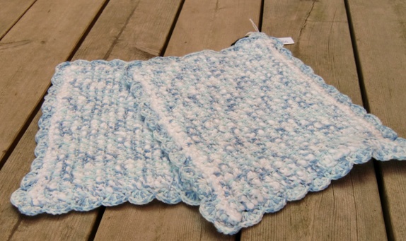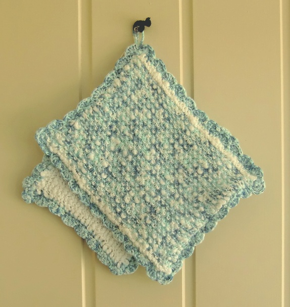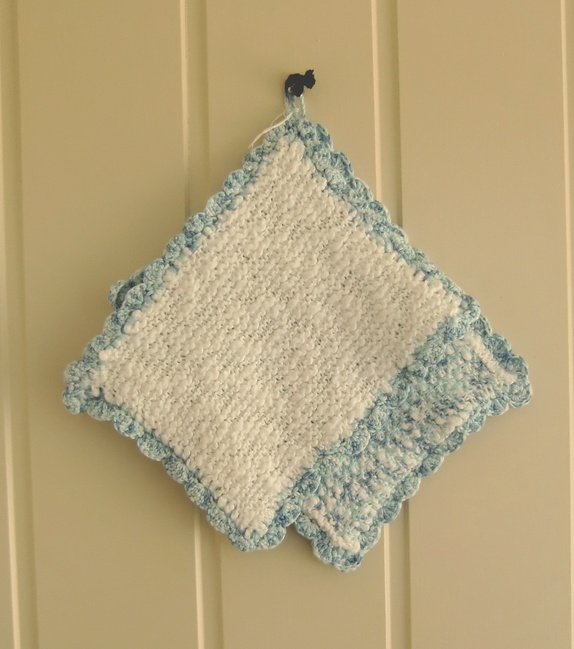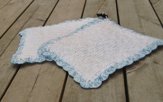 Gryteklutene er doble, den ene siden er hvit, den andre blå pastell med hvitt. Den lyseblå kanten som er heklet rundt vises på begge sider.