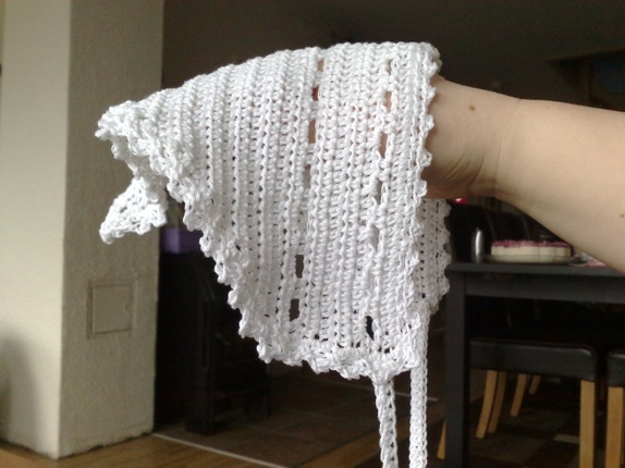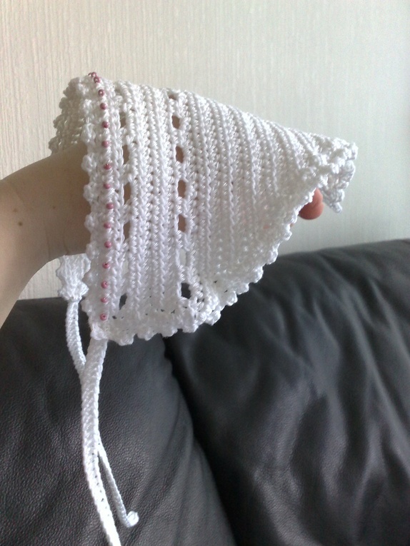 Skaut til baby/jente. Kan hekles på bestilling/etter mål. Hekles i bomullsgarn som tåler godt vask. Kan også leveres med perler langs kanten.
